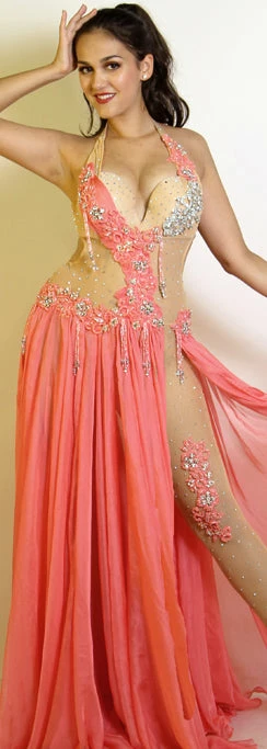 Lovely Venus collection belly dance costume in salmon, adorned with bling, beading, and embroidery.