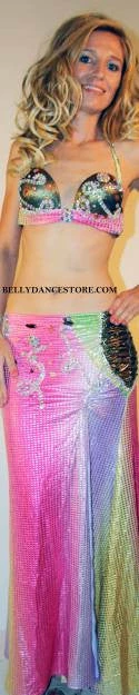 Clearance Costumes May have minor imperfections.Two-Piece costume with different shades of pinks and gold, yellow, and purple.