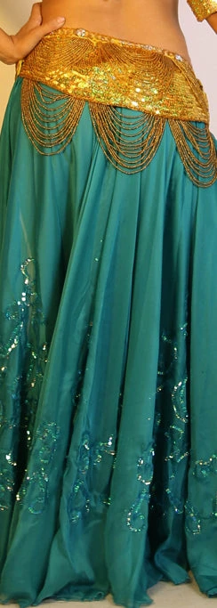 Enjoy the versatility of our Dream Collection bra and belt sets. Fully sequined and jeweled for your sparkling pleasure! The luxurious looped fringe is shaped to flatter and move with grace. This halter bra comes with a two-piece belt, for maximum size versatility along with sequined armbands. This set combines beautifully with skirts of all styles (sold separately) so you can maximize your wardrobe options. Available in gold, silver, and many other colors.