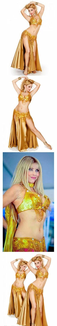 Enjoy the versatility of our Dream Collection bra and belt sets. Fully sequined and jeweled for your sparkling pleasure! The luxurious looped fringe is shaped to flatter and move with grace. This halter bra comes with a two-piece belt, for maximum size versatility along with sequined armbands. This set combines beautifully with skirts of all styles (sold separately) so you can maximize your wardrobe options. Available in gold, silver, and many other colors.