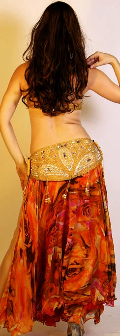 The top layer of the skirt is a lovely print of oranges, gold, and fuschia. The bottom layer i.s fuschia. The skirt has two slits.