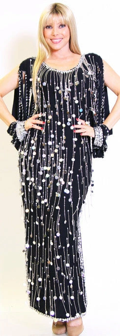 Classy Galabeya one-piece belly dance costume in black with silver paillettes and fringe that will dazzle your customers!