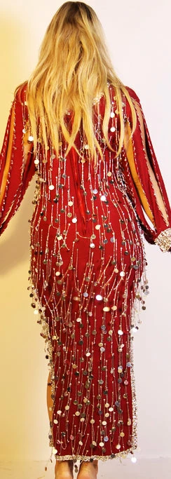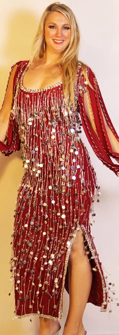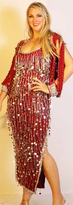 Gorgeous Galabeya one-piece belly dance costume in burgundy with silver dangles and fringe.
