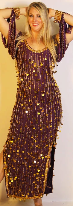 Gorgeous Galabeya one-piece belly dance costume in plum/purple with gold paillettes and fringe that will dazzle your customers!