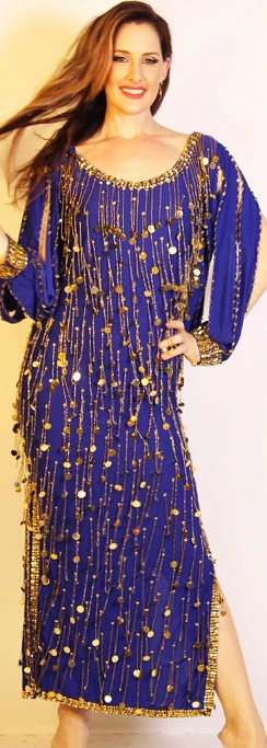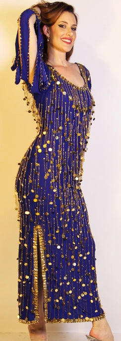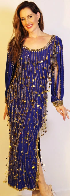 Gorgeous Galabeya one-piece belly dance costume in royal blue with gold paillettes and fringe that will dazzle your customers!