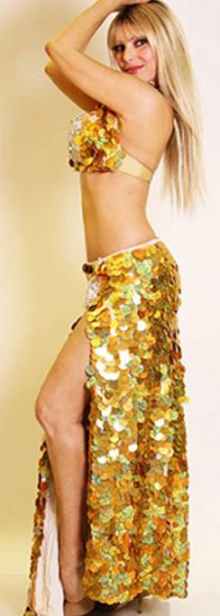 Gorgeous, dazzling two-piece belly dance costume in red.