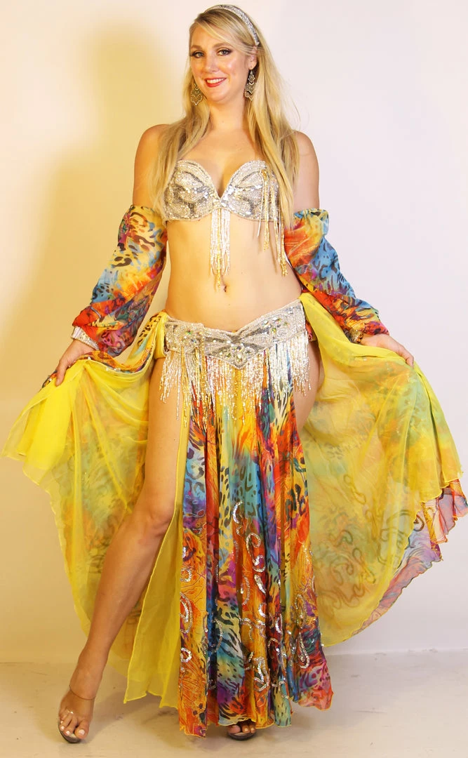 Pharaonics of Egypt Icicles belly dance bra and belt set in silver with gold highlights.