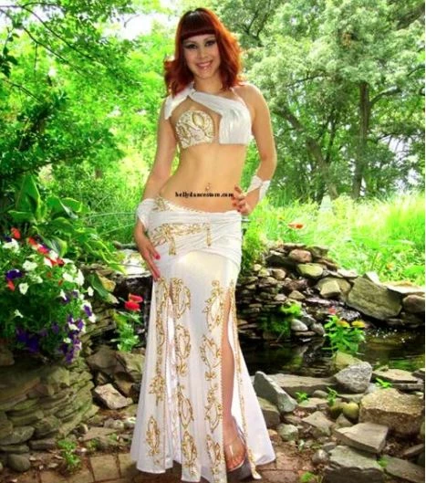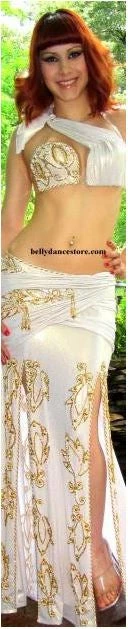 Gorgeous Eman Zaki two-piece designer belly dance costume in gold and white.