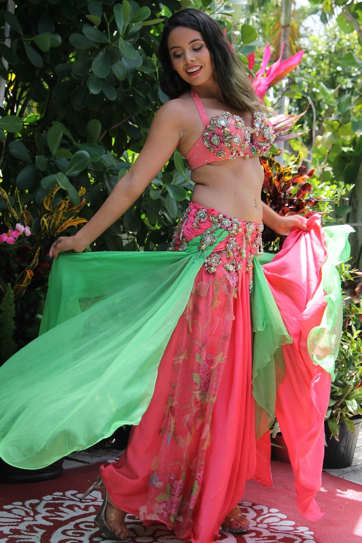 Mumtaz designer two-piece belly dance costume in pink/green, embellished with rhinestones, beads, and embroidery.
