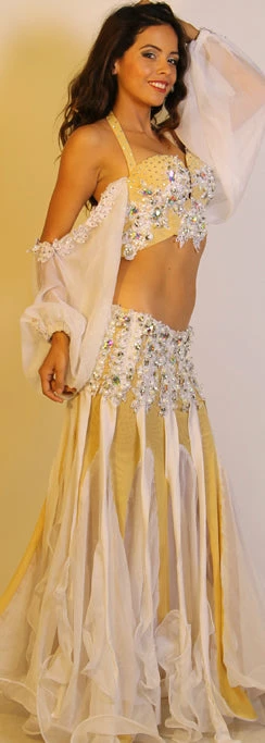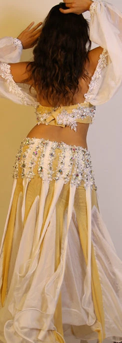 Elegant two-piece designer Mumtaz costume in white and cream.