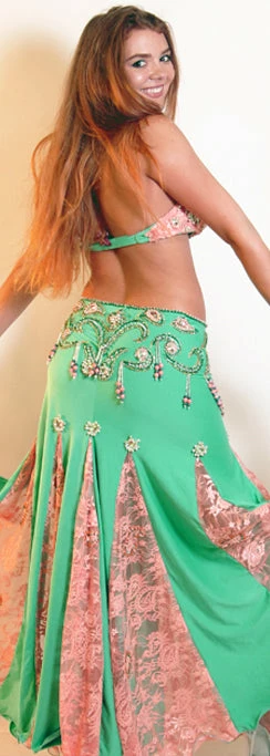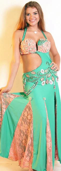 Mumtaz designer one-piece belly dance costume in teal, embellished with rhinestones, beads, and embroidery.