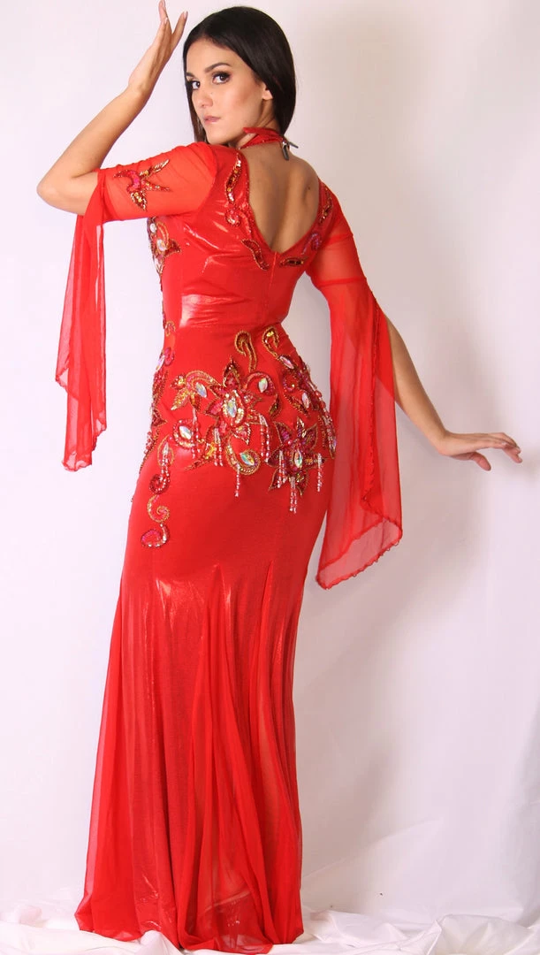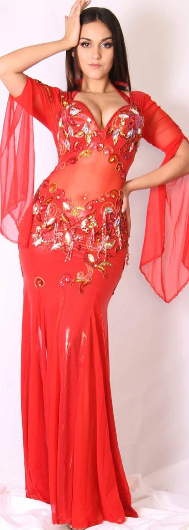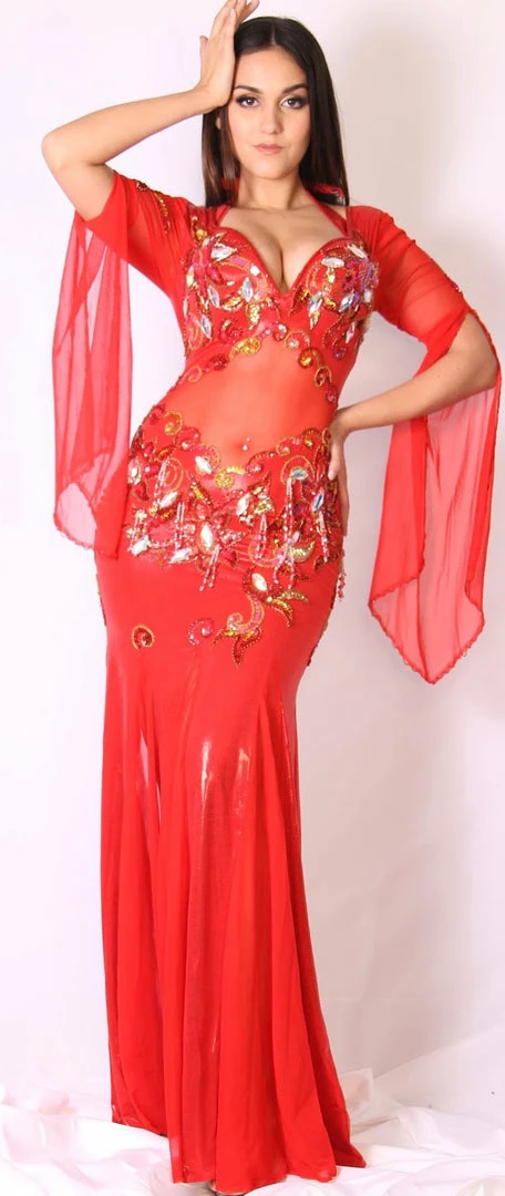 Mumtaz designer one-piece belly dance costume in red, embellished with rhinestones, beads, and embroidery.