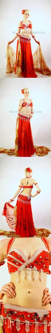 You’ll Be A Royal Garden Beauty In This Delightful Floral Costume From Pharaonics Of Egypt. Shimmery Chiffon, Metallic Shine Print Accent Chiffon, Ruching On The Bra And Belt Along With Contrast Rhinestone, Sequins And Beads And Cascading Crystal Fringe Create A Stunning Melange Of Delicate Color And Dramatic Contrast And Shine Reminiscent Of The Royal Shalimar Gardens Of The Moghul Empire. Halter Bra And Two Piece Belt Feature Sweet Contrasting Three Dimensional Bead Work And Large Crystals In Multiple Colors. The Front Half Of The Belt Has The Contrast Patterned Chiffon That Matches The Veil. The Dreamy Chiffon Skirt, With Two Slits Is Embellished In A Brand New Design With Holographic Sequins. This Costume Includes Four Arm/Ankle Band Accessories And A Delightful Hair Comb.